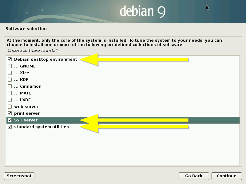 This Guide assumes you to install the Debian desktop environment, the SSH server and the standard system utilities at the Software selection dialog: